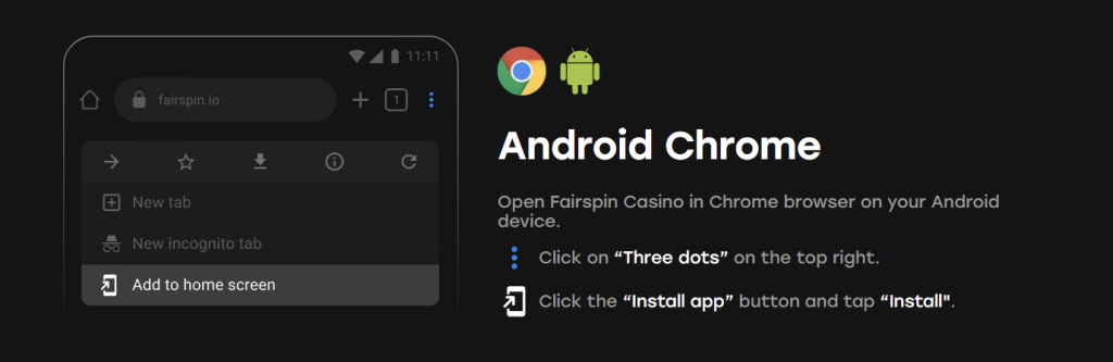 Ei, te ei pea alla laadima ĂŒhtegi ebakindlat .apk-faili vĂ€listest allikatest. Kasutades PWA-tehnoloogiat, paigaldatakse Fairspin app otse teie turvalise Chrome-brauseri kaudu. See on nii turvalisem kui ka lihtsam kui Ă€pi-failide manuaalne paigaldamine.
